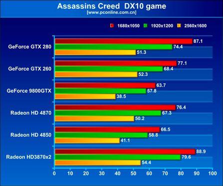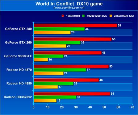 这个游戏是新一代的N卡胜出,但在1920x1200 4AA下,9800GTX和HD3870X2处于幻灯片或画面静止不动的状态,Radeon HD 4850/4870能够完成测试。