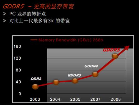 从AMD的官方资料来看,显存带宽得益于GDDR的更新换代,在近几年有了不少的飞跃,其中DDR2——GDDR3显存带宽经历了一次成倍的增长,而另一次显存带宽的大爆发,将在GDDR4——GDDR5的这段过程上发生。