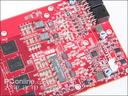 采用了VT1195数字多相PWM供电方案。使用VOLTERRA数字供电方案的HD4870供电部分看起来非常简洁,采用了三颗CSP封装的VT1195SF芯片搭配VITEC 59P9853三相耦合电感以及众多细小的电容之王——MLCC多层陶瓷电容(Intel CPU基板下面常见)构成了完美的核心供电。同时在显存供电部分同样使用VOLTERRA方案,同时具备控制和提供电流输出VT238AWF芯片+Pulse 耦合电感,共2相为显存供电和超频打下强悍基础。