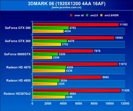 Radeon HD 4870在3DMark 06的表现比较出色,总分甚至超过了Geforce GTX 260,在SM3/HDR项目超出了500多分。