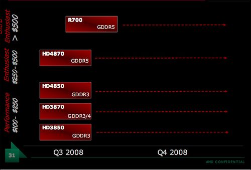 从上面的路线图中我们可以看到,AMD-ATi在RV770这块芯片组的产品线上,将会针对中端、中高端和发烧级顶端用户发布Radeon HD 4850 / Radeon HD 4870 / Radeon HD 4870X2这三款不同型号的显卡。