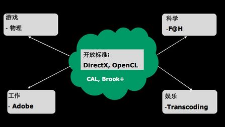 ATi垂青的是由苹果公布的OpenCL开放式标准,它其中包括了物理运算、科学、图形工作和娱乐等多方面的协调,旨在高度利用GPU的资源,来承担更多的工作。