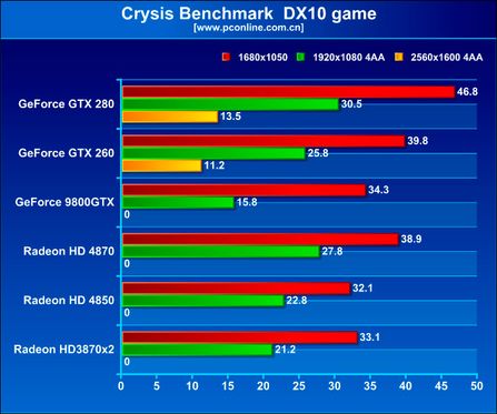 在显卡危机Crysis中,Radeon HD4870的表现令人眼前一亮,尤其是打开AA后,成绩超过了GTX 260,在超高分辨率中,由于显存不足的关系,测试过程一直低于10FPS,所以我们采用记0处理。