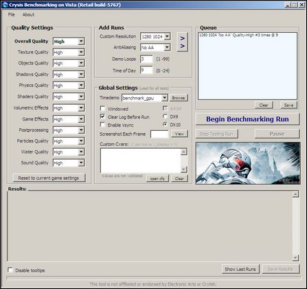 由于Crysis是目前对显卡要求最高的DX10游戏,因此在本次评测中,我们将分辨率锁定在1280x1024、1600x1200、1920x1200所有的画面设置都调至高,同时关闭/开启AA和AF两组测试。为了避免测试误差,我们使用了目前最新的Benchmark测试,画质全部设置为HIGH。