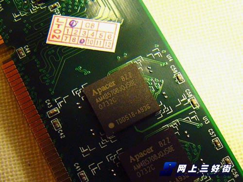 这款产品的芯片(即颗粒)采用了时下最成熟的80nm工艺制作,每枚芯片容量为64MB,双面16枚芯片总容量1024MB即1GBytes。这款产品的芯片是宇瞻从芯片封测厂订制的产品,芯片表面打印着清晰的宇瞻标志。虽然定位普通家庭用户,不过这条内存模组对于一般的玩家来说足够使用。正常的通电加压保证产品能够以稳定的频率工作,这款产品同时拥有不错的兼容性能。