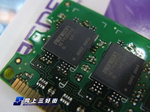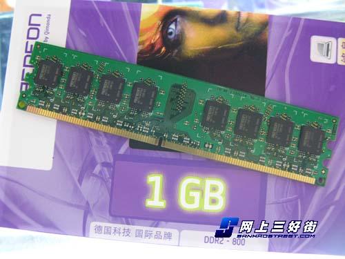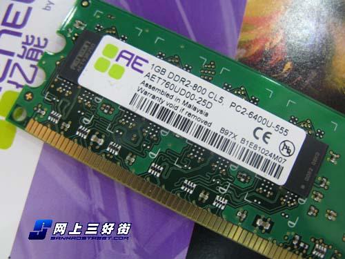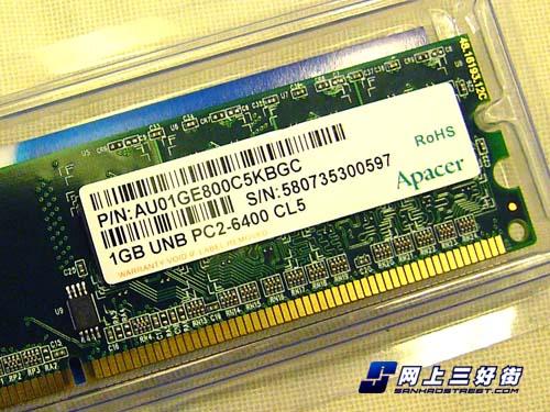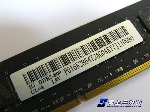 这款产品额定等效频率800MHz,时钟频率为400MHz,总容量1GB,CL延迟为5,详细延迟序列不详。这款产品采用环保无铅工艺制作,通过了欧盟严格的ROHS认证。
