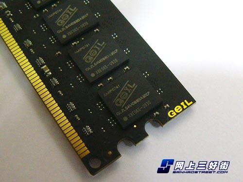 这款产品采用成熟的80nm芯片制作,每枚芯片的容量为64MB,双面16枚芯片,总容量1024MB,即1GBytes。金手指采用真金实料的金箔制作,防锈耐插拔,而且具有很好的导电性,在PCB边缘醒目的金色“GEIL”Logo,倍显豪华。