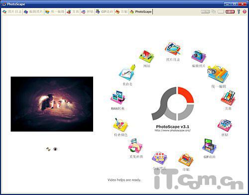 谈起PhotoScape的第一个绝活儿,就是它那新颖的主界面了。怎么新颖?嘿嘿,保证您以前从没见过。原来,和我们平时经常见过的图标排列方式均不相同,PhotoScape创新性地将所有按钮,以圆圈的形式围成了一圈。使用时只需用鼠标在圆圈中随意点击,就能轻松进入某项功能。而且,除着鼠标的划过,每个对应图标都会产生一个缩放效果。这样,我们就能更加清楚地,看到当前选取的功能了,如图1所示。