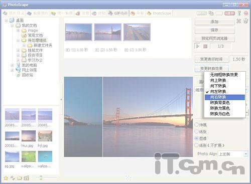 在网上,Gif动画的应用十分广泛。正由于其能够非常直观地展现画面间的变换,因此,很多时候我们都需要制作一份Gif动画。虽说,制作Gif动画,对于Photoshop(可借助其附带的ImageReady组件完成)和光影魔术手来说,都是一件“无法完成”的任务。但在PhotoScape眼中,却仍然还是“小菜一碟”。事实上,当我们打开“GIF动画”标签,将待处理的静态图片,拖入处理框后。再点击右侧按钮,设置好画面的切换时间及切换特效。便能通过中间图片框,看到动画的预览特效。而后,点击“保存”按钮。这样,一幅漂亮的GIF动画就新鲜出炉了,如图7所示。