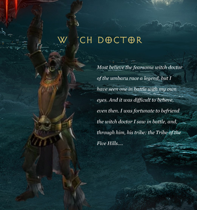职业介绍:游戏中将有五大职业,2008WWI中分别公布了一些野蛮人和巫医的资料。玩家在游戏中不能选定角色的外型,但是可以设定性别。