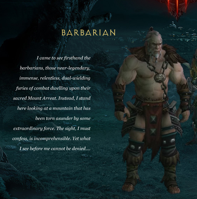 来自圣山亚瑞特Arreat的巅峰,接近传奇中的人物,残暴,强大,双持是野蛮人的特点,能像旋风一样卷入战斗撕碎敌人。“我望着那被邪恶力量摧毁的山巅,我必须承认,这景象不可思议。然而我不能背弃我面前的一切”,因为那是亚瑞特山,野蛮人的故乡。