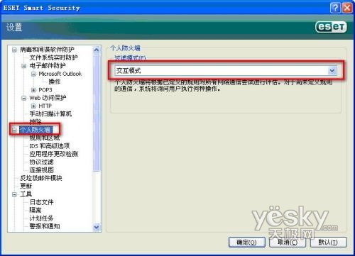 ESET NOD32安全套装的防火墙在默认安装状态下,是采用”自动模式”,此模式下,ESET NOD32安全套装的防火墙将自行评估所有的网络通信,这将允许所有标准传出连接并阻止所有非主动发起式传入连接。