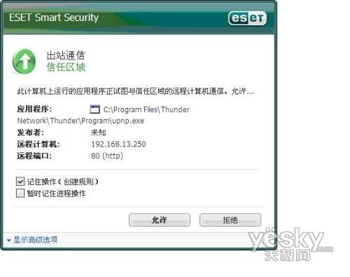 如上图,ESET NOD32的防火墙已经侦测到UPNP的通信,选择”记住操作(创建规则)”,允许即可。