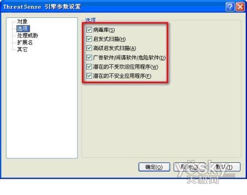 我们再次点击”ThreatSense引擎参数设置”的设置按钮,打开高级设置项:
