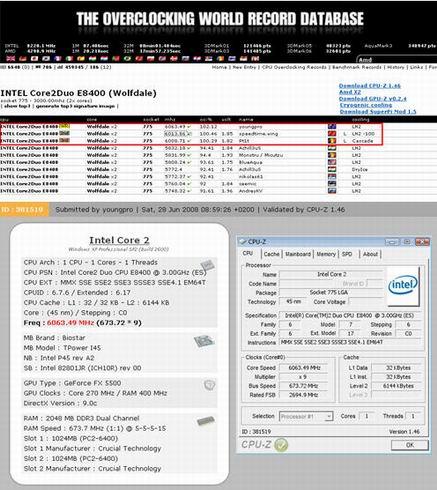 由于我一直想升级到E8400,故此对超频世界纪录网站:http://www.ripping.org/database.php?cpuid=640十分关注。而今天才真是过了眼瘾,映泰的TPOWER I45出尽了风头包揽了E8400的世界纪录前三甲!力压DFI的LP UT P35和ASUS的Commando!分别报出了6063.49、6013.86和6008.71MHz!我国本土的超频高手余孟瑶Speedtime.wing成功的跃居第二名,散热方式为液氮!
