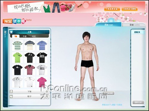 虽然,为了照顾庞大的女性购衣团,试衣间的默认页面,被设成了“女装”版。但这并不意味着男士们,就无法通过试衣间,找到自己心仪的服饰了。事实上,当我们在页面右上角,点击“男装men”标签时,便进入了男装的试衣页面,如图2所示。