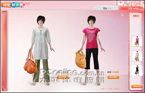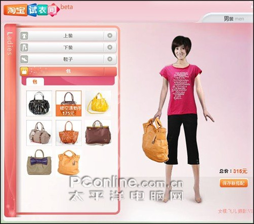 找好了适合自己的试衣页面,我们就可以随心所欲地在模特上“试穿”各式衣物了。相信细心的朋友早已发现,在试衣页的左侧,淘宝已经按照衣物类别,为我们提供了几十套默认的服装。只要用鼠标在中意的衣物上点击一下,那么这件衣物便会马上“穿”到模特身上。而且,如果您感觉“穿着”的效果,不太理想。只要再次点击其他衣物,那么这件“衣服”便会马上被刚刚点击的“新衣”所替代。这样,不必怎么费事,我们就能轻松找到自己喜欢的款式了。而且,在这个过程中,试衣间还会随着我们的搭配,自动将整套衣饰的价格,显示在模特右下方,让整个搭配立时变得明明白白,如图3所示。
