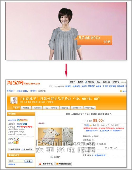 等一切挑选完毕,我们就可以下单,将选好的漂亮衣衣归为已有了。这时,有MM问了。是不是还得像以前那样,前往淘宝主页,搜索相关宝贝,才能最终完成整个购买呢?嘿嘿,根本不会这样麻烦。其实,您只要将鼠标悬停于试好的衣服上,点击一下。这时,浏览器便会自动将我们引导到该宝贝的展示页面,至于剩下的嘛,就不必俺再多说了吧,如图6所示。