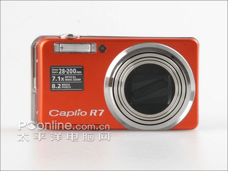 理光R7使用一块2.7英寸透明非晶质硅LCD显示屏,23万像素的显示效果十分出色,配置了一枚有效像素为815万,7倍光学变焦镜头,支持28mm广角,镜头占据了机身正面约1/2的位置,镜头环采用了抛光处理,外观鲜亮夺目。