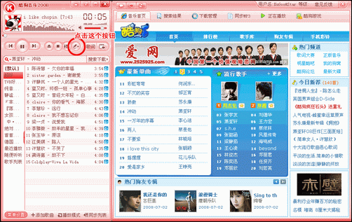 图1 酷狗音乐2008使用"默认皮肤"+"红色"后的效果,点击图中的按钮