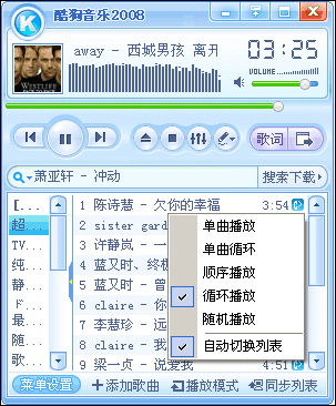 让自己的音乐播放列表自然有序的播放下去,直到最后一首歌……一边工作一边享受着音乐的节奏,确实是一件令人愉快的事情。酷狗音乐2008可以让你轻松实现:点击"播放模式"-勾选"自动切换列表",如图4所示: