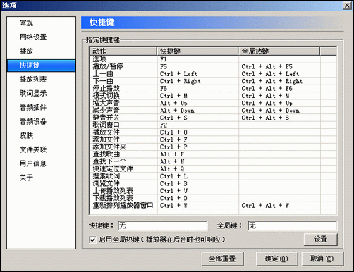 在听音乐时,一些快捷键能够帮助我们轻松控制歌曲及声音的大小,酷狗提供了约20余项功能的快捷键,同时还提供了全局热键的功能(全局热键可以让你在做任何事的同时,都能够对酷狗进行控制)。如"播放/暂停"的快捷键是"F5",全局热键是"Ctrl+Alt+F5"等等。点击"菜单设置"-"选项"-"快捷键",即可进行设置,如图3所示: