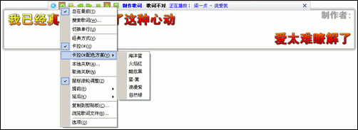 酷狗音乐2008的亮点功能--酷狗"动感歌词",一举实现卡拉OK歌词精准显示,而且显示颜色可任意修改,简直爱死了。如下图: