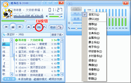 无EQ不音乐,如果拥有强大的EQ功能,就可能根据自己喜爱的音乐风格,播放出与众不同的音质来,酷狗音乐2008的EQ功能能轻松满足你的需求。如图5所示: