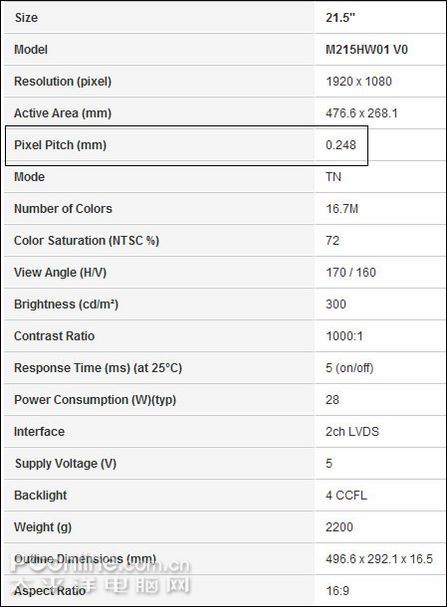图:友达21.5寸宽屏液晶面板M215HW01相关参数