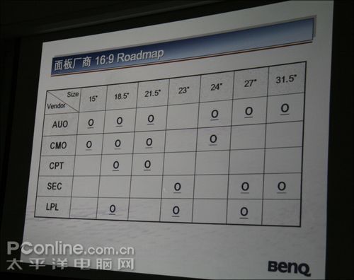 这种情况下,拥有6代液晶面板生产线其它几家液晶面板厂商开始考虑更具备市场竞争力的产品,他们首先想到的是切割和液晶电视面板16:9屏幕比例一致的产品,友达光电(AUO)就是其中的代表。下面这张图片是五大液晶面板厂商即将推出的16:9屏幕比例液晶面板产品Roadmap,大家可以看到:在24吋以下的产品线上,6代生产线的三家台系液晶面板厂商友达光电(AUO)、奇美光电(CMO)以及中华映管(CPT)的产品线是基本一致的;7代线以上的三星光电(SEC)与LG-Philips联合(LPL)的产品线也大同小异;在2008年的Q4,届时还会有16:9比例的31.5寸桌面液晶显示器旗舰产品出现。