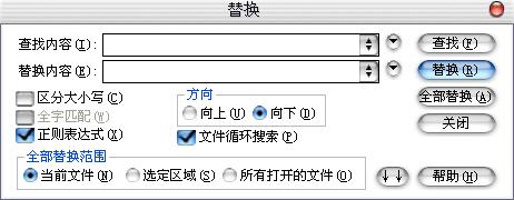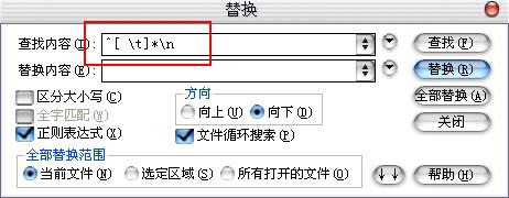 1.选择“搜索”菜单的“替换”命令,出现如图所示的文本替换对话框。选中“正则表达式”复选框,表明我们要在查找、替换中使用正则表达式。然后,选中“全部替换范围”中的“当前文件”,表明对当前文件操作。(提示:可以同时打开多个文件进行操作,只要选中“所有打开的文件”)。