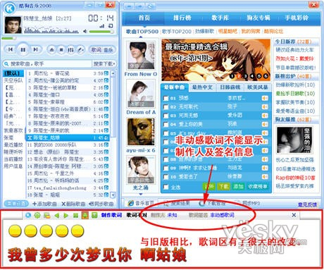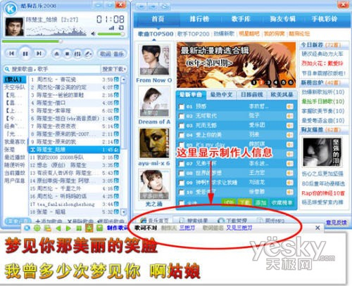 第二步:打开酷狗2008,最新版酷狗已经添加非常有个性的皮肤了(如图2所示),新版歌词也有了很大的改变,如下图标红区域所示(把鼠标在歌词上停留3秒,就会出现如图所示的框框了)。点击图2中的“制作歌词”按钮,就可进行歌词制作了。