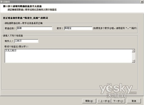 第四步:输入“歌词制作信息”,在弹出的如图4所示的窗口中输入歌曲及制作人信息,点击“下一步”按钮,如图所示: