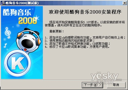 第一步:下载最新的酷狗2008 V5.107测试版,双击运行后(如图1所示),连续点击下一步即可把酷狗2008升级到最新的版本。