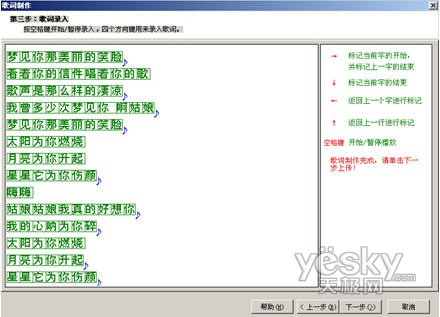 第六步:编辑歌词,这是酷狗动感歌词制作过程中最享受的一步了——跟着音乐节奏,敲打着键盘上的方向键就可以完成歌词的制作,就像弹钢琴一样。不过,这里要注意的事,如果你对这首歌不熟的话,请先多试听几遍,让自己大概记得歌曲的旋律,然后,根据所演唱的歌曲内容,逐字敲下向右的方向键就可以了;如果有错误,可以使用向左和向上的方向键来更正(如图6中所提示);如制作中有事要离开,使用空格键暂停即可。注意在制作的时候,你键入歌词的准确性直接影响了歌词的质量哦,如需要编辑高质量的歌词,请不妨多试几次,让自己发挥最好的水平。