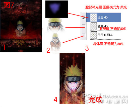 B:旋涡鸣人的人物加强处理。为了突现出人物的核心,鸣人身体颜色需要减淡甚至降低不透明度,但人物的脸是要被“螺旋丸”的蓝光所反射的,因此脸需要加强亮度,在同一图层上不方便修改,因此这里将鸣人的图层复制一层,将上层的鸣人脸部以下的部分勾勒后进行羽化,然后在脸的上面新建立一层,用画笔随意涂抹颜色“电光蓝”,然后将图层模式设定为“柔光”这样,画面就突出了脸部被强光反射的效果。如图7。