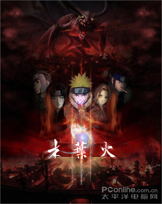 本次海报教程笔者选择了人气动画《火影忍者-疾风传》做为素材,根据自己的想像原创一了这款海报。动画版已经播出到《木叶全城封锁》这个部分,一场血战不可避免,鸣人会不会再次利用九尾的力量呢?一切都拭目以待,现在我们就可以根据这一线索,将海报的背景设定为木叶城和九尾,海报的正中央是新卡卡西班和最近剧集里频繁出现的阿斯玛,几人在火焰的包围中,鸣人释放出螺旋丸,海报的整体给人一种大战一触即发的感觉,临场感,就是本海报需要表达的主题。