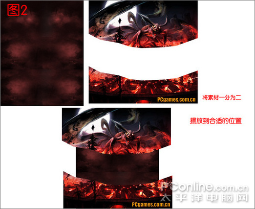 B:打开素材1,用“多边型索套工具”将素材图一分为二,下面木叶城市的部分,放到主文件下面,上面的九尾狐狸,放到主文件的最上面。如图2。