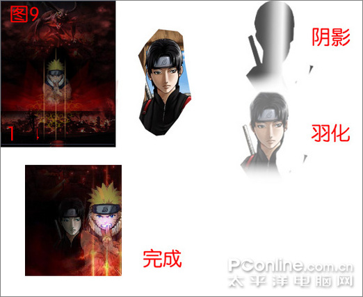 佐井的制作,打开素材4 用“多边型索套工具”勾勒出人物头部加一点身体,然后勾勒出边缘,羽化8像素。这里要注意的是,因为鸣人层是不透明度60%,所以佐井在鸣人身后的部分要删除掉。然后新建立一层,用3号画笔在人物脸的侧面随意涂抹,然后进行一下高斯模糊即可。如图9。
