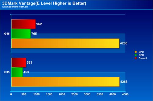 在3DMark Vantage的评测中,G45主板出乎意料地获得了接近1000分的高分,虽然它和我们熟悉的780G、Geforce 8200相比还有非常大的差距,但相比于G35的成绩,G45已经领先了67%。