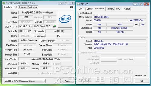 在看评测前,我们先来看看最新的GPU-Z截图。或许是驱动还没完善的原因,我们在最新的0.2.5版本GPU-Z中无法确定G45芯片组的具体规格,仅仅能看到此时系统划分了32M内存作为显存。