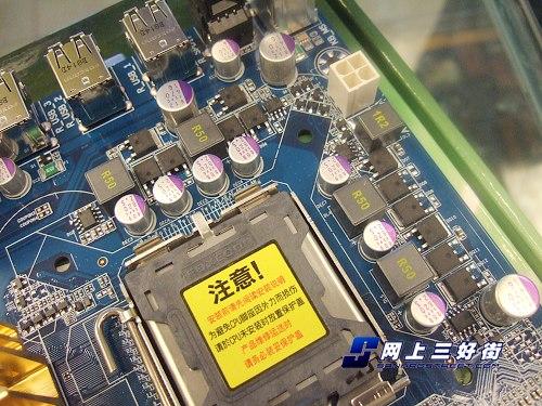 供电部分技嘉EP43-DS3L可以说是非常扎实,4相回路也为用户超频带来更大的空间,特别是用料方面。大量日系固态电容搭配R50封闭式电感,每相还搭配3颗MOS管,超频性能非常突出。