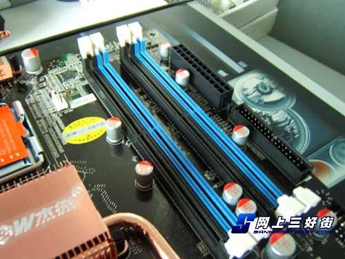 扩展方面七彩虹C.P45 X7主板为我们提供了2条PCI-E 16X插槽、2条PCI-E 1X插槽和2条传统PCI插槽,6个SATA II接口便于设备扩展,1个IDE接口和一个软驱接口即使是老式光存储设备也可以完全兼容,4条内存插槽全面支持双通道DDR II 800/1066内存规格。对于用户对内存需求上也能满足。