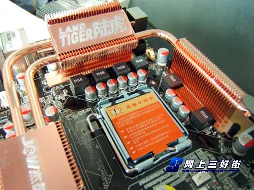 在CPU供电方面,杰微 陆虎先行者P35LH主板采用了6相供电设计,并且采用了优质的固态电容和全封闭式电感R56,同时每相供电搭配了3个MOS管,并且将MOS管上加装了纯铜散热器片,并且用热管连接,供电设计非常强悍。这样的供电设计能最大限度的保证处理器的供电稳定,也为日后的超频打下了良好的基础。