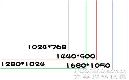 从上面这张主流尺寸产品的分辨率示意图大家可以看到,即使是15.6寸宽屏提供的1366*768级别分辨率也足够使用,17寸和19寸提供的1280*1024分辨率已经足够理想,而入门级的19寸宽屏提供的1440*900分辨率也不错,它们相对17寸CRT的1024*768级别的分辨率有了很大的提升,当然,如果条件允许的话,20寸和22寸宽屏的1680*1050分辨率则更大。当然了,尺寸的选择会因人而异,有些用户对17英寸和20寸宽屏的小一点儿的点矩感到不舒服的话,那么就只能购买其他尺寸的产品了。