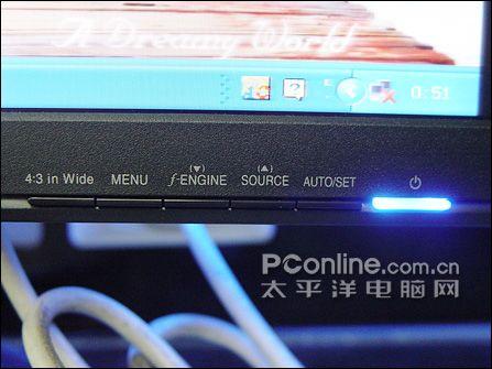 性能上,面板采用LPL的19英寸宽屏面板,300的流明亮度,动态对比度达到8000:1,响应时间为5ms。