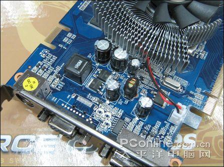 供电部分,盈通 G8500GT-256GD2冰河世纪采用了非公版设计,用料选用了电解电容搭配半封闭式的陶瓷电感,为显卡的稳定工作提供保障。