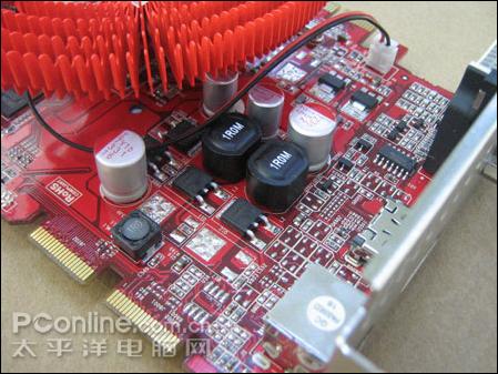 斯巴达克 HD3850 256M DDR3由于显卡覆盖了大型的涡轮散热器,把供电部分遮挡住,但仍然依稀可以看到显卡采用了大量的固态电容和封闭式电感,用料还是相当扎实的。