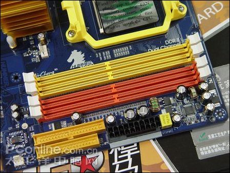 悍马HA03-GT主板提供4个DIMM内存插槽,规格为DDR2 800/667,每条最高支持2G,总共可扩展至8G,并以颜色区别双通道模式。内存供电部分做工也非常扎实。