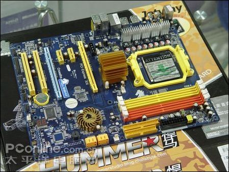 和前代悍马相似,整体采用蓝色PCB板,配合橙色系的接口,点缀以密密麻麻的富士通固态电容,巨大的MOS管,悍马标配的Debug灯和硬件RESET开关,悍马HA03-GT主板北桥为AMD 770X芯片组,在显卡支持方面提供双x8模式的CrossFire模式。并支持新一代HT 3.0传输总线和PCI-E 2.0规格。